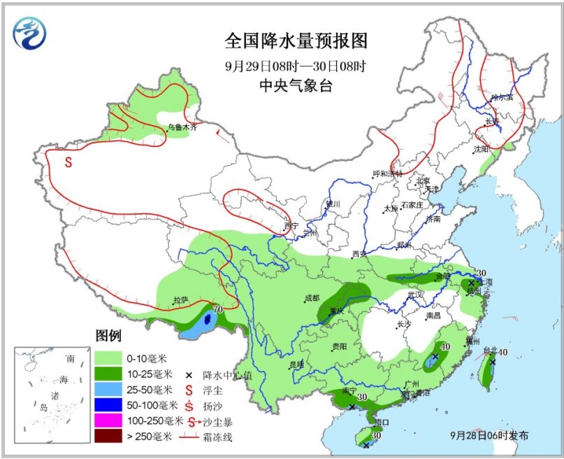 图1 全国降水量预报图(9月28日08时-29日08时)