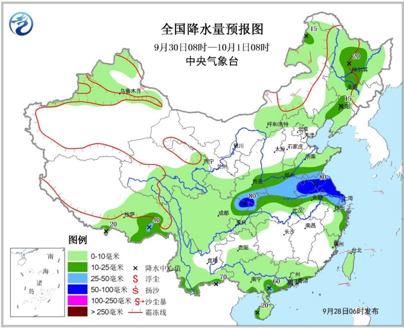 9月30日起至10月2日,四川盆地东部、汉水流域、黄淮、江淮等地的部分地区还将有一次较强降水过程。