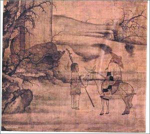 图中骑驴人是曹操的说法一度比较流行;然而,也有美术史专家认为,骑驴的人不是历史政治风云人物曹操,而是唐朝一位安静的宅男诗人孟浩然。