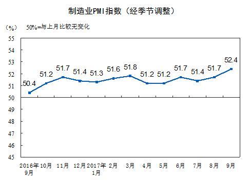 据统计局网站消息,2017年9月份,中国制造业采购经理指数(PMI)为52.4%,比上月上升0.7个百分点,制造业继续保持稳中向好的发展态势,扩张步伐有所加快。