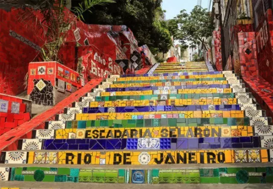 位于里约热内卢的塞勒隆阶梯(Escadaria Selarón),原本只是贫民窟内一道普通的水泥阶梯。1990年,来自智利的艺术家Selarón将垃圾堆里的废弃瓷砖回收利用,镶嵌在这250级阶梯之上。到后来,超过60个国家的游客也纷纷捐助各种材料,和艺术家一起共同完成了这件充满了爱与温暖的马赛克艺术品。