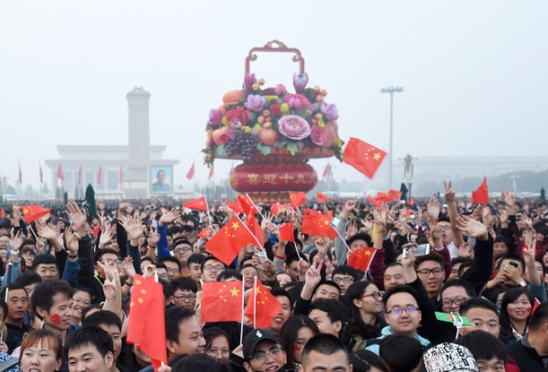 当日清晨,来自全国各地的各族群众在北京天安门广场观看升国旗仪式,庆祝中华人民共和国成立68周年。