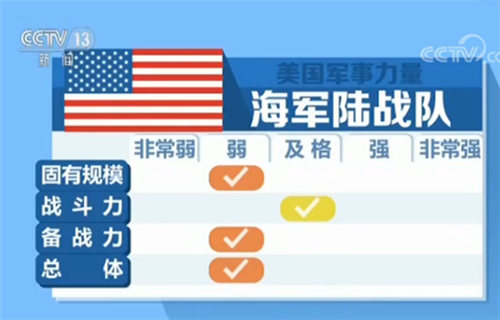 海军陆战队的固有规模、备战力都被评级为“弱”,只有战斗力评级为“及格”。报告认为,美国海军陆战队也缺乏可靠的军机,目前只有41%的固定翼和旋翼飞机可以飞行。