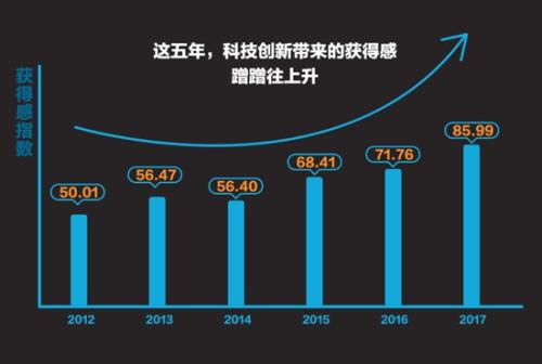 报告显示,2012-2017年,中国人科技领域“获得感”总得分由50.01上升至85.99,5年间增长了72%;其中,过去一年科技“获得感”上升最快,增长约20%。这可以在过去5年我国科技成果集中爆发的高铁、移动支付、网购、共享单车等新科技快速普及的事实中得到印证。