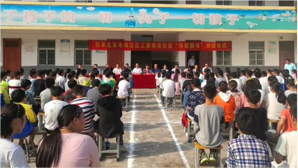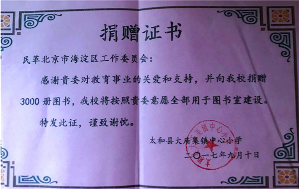 “博爱”是孙中山先生政治学说中的一个核心思想。使人们在“互助” 与“博爱”的精神启导下,努力消除人与人之间的矛盾和贫富的差别,实现人类的和谐、幸福和大同。这是孙中山对人类社会的文明、进步与和谐作出的重大理论贡献。民革以继承和发扬中山精神为己任,把“博爱”作为一种品牌推动民革的社会服务工作。9 月 11 日—12 日,在第 33 个教师节之际,民革北京市海淀区工委一行分别在安徽省政协副秘书长、民革安徽省委驻会副主委吴延利,民革安徽省委社会服务联络部部长张传仓,民革阜阳市委主委陶颖,民革六安市委专职副主委赵丰才,中共太和县政协主席杨代军,中共金寨县政府副县长董益乐等领导的陪同下,先后对阜阳市太和县大庙集镇中心小学、六安市金寨县白塔畈镇项冲村王畈小学进行了教育扶贫、博爱图书捐助。安徽省民革吴延利副主委在出席捐助仪式上指出,教育是精准扶贫的关键环节,是切断贫困代际传递的根本手段。民革北京市海淀区工委为贫困地区的孩子们送来了爱心和希望,他们捐助书籍只是一种形式,更多的是鼓励同学们多读书,期盼大家都能学有所成,能改变自己家庭的面貌,将来能为国家、为社会多做贡献!
