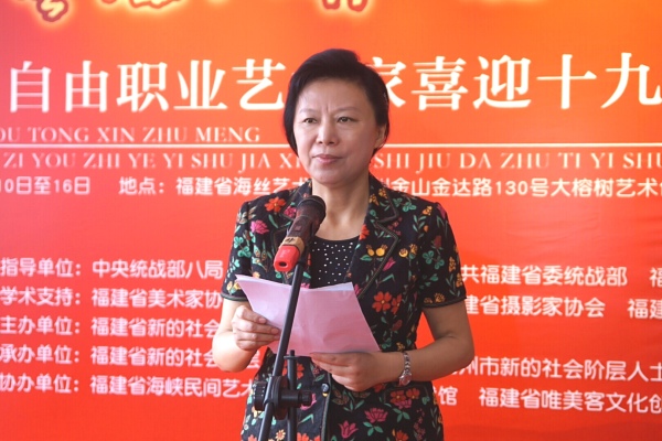 雷春美在开幕式上讲话。她说,本次艺术展是首次以我省自由职业艺术家为主体的活动,也是福建省新的社会阶层人士联谊会作为主办单位首次举办的活动,对于激发我省广大自由职业艺术家创作热情,为党的十九大胜利召开营造良好氛围具有重要意义。希望我省自由职业艺术家坚持深入实际、深入生活、努力创造更多无愧于时代、更具正能量的优秀精神文化作品,为文化强省建设,为弘扬中国精神、凝聚中国力量做出新的更大的贡献。