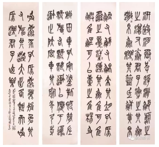 张国恩:我自幼受长辈熏陶,对于昌硕公的金石书画莫大喜爱,18岁进入工艺美术研究所工作深入学习,30岁拜吴门第三代曹简楼为师。吴门一学似海深,一晃就是30年,几乎每天都在如切如磋如琢如磨的临摹习作中度过,虽谈不上头悬梁锥刺股,但对于我而言,一箪食,一瓢饮,虽人在陋巷,内心却有着无比的富足和喜悦。本次的作品是临昌硕公石鼓文4条屏。石鼓文,又称石刻之祖,因其在十个鼓行石头上记载了秦国国君游猎的10首四言诗,亦被称为“猎碣”。石鼓文之体,上乘西周金文,下启秦代小篆,是集大篆之成,开小篆之先河,在书法史上起着承前启后的作用。因此,石鼓文享有“书家第一法则”之美誉。在历代书家之中,以清朝海派书画巨擘吴昌硕为石鼓文之集大成者,他将石鼓文之笔法融入书画之中而成为中国书画史上一代大家。习近平主席曾在与世界汉学交流座谈中谈到,他最大的使命就是要让五千年中华文化不要断代,要让中华文化继承发展并传承下去。这可以说是国家之幸!传承、创新的过程中,我们要发扬工匠精神,耐得住寂寞,挡得住诱惑,外加百分百的传承,唯有百分百的传承才能懂得该往何处发展。(心吧)