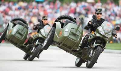 5月1日,中国人民解放军驻澳门部队在氹仔营区举行第十三次军营开放暨军事体验日活动。图为驻澳门部队进行女子摩托车驾驶表演。