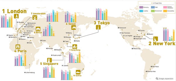 2017年全球实力城市指数:伦敦、纽约、东京、巴黎、新加坡、首尔、阿姆斯特丹、柏林、中国香港、悉尼排前十。