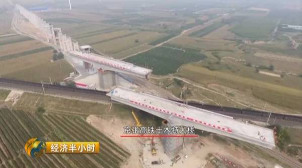 中铁大桥局京张高铁施工五标三工区工程部长何乔东:每天有160多个列车经过,为了降低对这个铁路运营的安全风险,我们采用吨顶转体的方式,把这个风险降到最低,桥的转体角度31度,转体重量5613吨,是我们现在修建京藏高铁前线最重的一个转体桥。