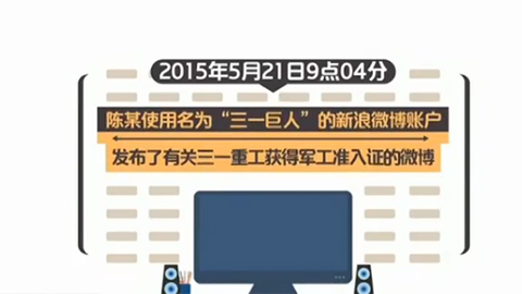 央视网消息:2015年5月21日9点04分,陈某使用名为“三一巨人”的新浪微博账户发布了有关三一重工获得军工准入证的微博。