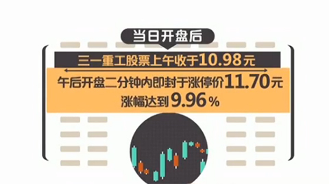 当日开盘后,三一重工股票上午收于10.98元。午后开盘二分钟内即封于涨停价11.70元,涨幅达到9.96%。三一重工股价的大幅上涨,既偏离当日上证综指和所属板块的走势,也偏离该股5月21日之前的历史走势。