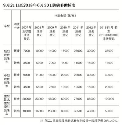 淘汰补助标准分为三个阶段,分别是9月21日起至明年6月30日;明年7月1日至12月31日;2019年1月1日至9月20日。其中,第一阶段报废或转出获得的补助最多,第二阶段、第三阶段分别较其下调20%、40%。