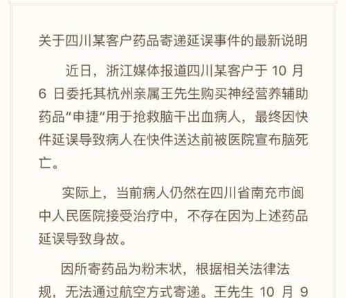 10月15日有媒体报道称,杭州的王先生亲戚因脑干出血入院,后委托王先生在杭州购买“申捷针”用于抢救治疗,但药品于10月9日通过顺丰速运寄出后,直到14日药品才抵达四川省南充市,而病人已于13日被宣布脑死亡。