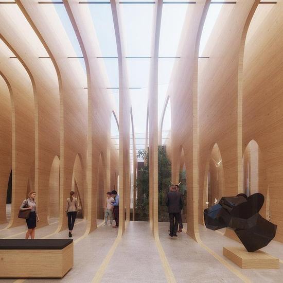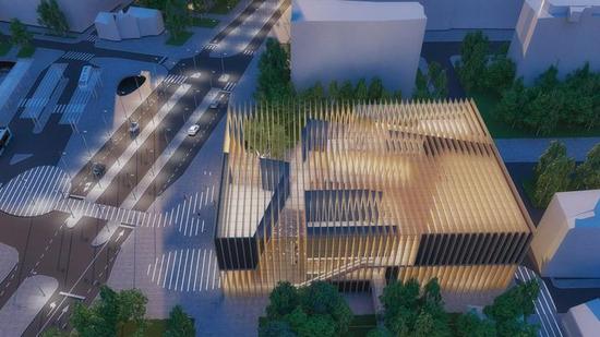 来自 3GRATTI 的方案在今年二月提出,它还包括博物馆所在广场中的地下停车场、办公楼和高层住宅楼,总规划面积接近 7000 平方米。其中,尺度巨大的木片墙是这个方案的最大亮点,它们构成了这座占地 4700 平米、几乎呈全透明状博物馆的主体。