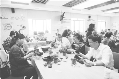 近日,农工党江苏苏州市委会妇女工委组织党员志愿者来到景德公益坊,与精神残疾患者及其家属一起制作文竹小盆景。(吴晓庆)