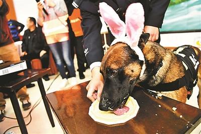 北京市公安局办警犬集体生日会 吃特制蛋糕卖萌