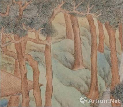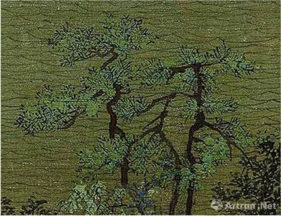 比如,在松针表现上,与《千里江山图》的乱撒针松针不同,以轮形针、扇形针或穗形针等一簇簇排叠在一起的松针,在此后染色时,只是大面积的铺染,而不是逐簇分染,如仇英《桃村草堂图》轴等。