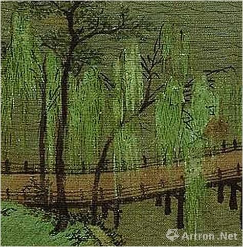在松针、柳叶及竹叶的笔色结构上,《千里江山图》都表现出笔墨与色彩间的互相呼应与顾盼,以至,如果我们将其色彩滤掉,其笔线自身就几乎很难构成松针、柳叶及竹叶的完整形象,形、色、墨三者的关系即是如此紧密。这一点,我们在《千里江山图》与元代以后的青绿山水的比较中就可看得更为明晰,后者通过笔墨对于松针、柳叶、竹叶形的塑造已经十分充分,此后的石青、石绿就只是简单的平铺,就体现不出形、笔、色间的互补关系了。