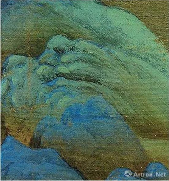 这种色彩层叠关系体现了中国绘画颜料使用的一个特点,它不像油画那样的塑造式的笔触覆盖,而是通过一遍遍不同色相的色彩叠合,而形成色层之间的显、露、隐、没,以及由多层积叠而形成的色彩厚重效果。