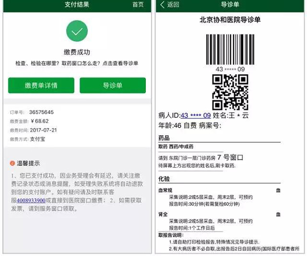 以往医生给患者开完处方单或检查检验单等,患者需要前往窗口或者自助机进行缴费。而现在,患者可以直接在手机上打开自助缴费,通过微信或支付宝进行在线支付。目前该功能仅支持自费用户,北京医保用户可通过手机查看缴费清单。缴费成功后,患者将收到电子导诊单,提示取药窗口或检查检验的位置,为下一步流程做好告知服务。