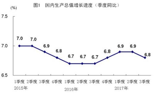 初步核算,前三季度国内生产总值593288亿元,按可比价格计算,同比增长6.9%,增速与上半年持平,比上年同期加快0.2个百分点。分产业看,第一产业增加值41229亿元,同比增长3.7%;第二产业增加值238109亿元,增长6.3%;第三产业增加值313951亿元,增长7.8%。三季度,国内生产总值同比增长6.8%,经济连续9个季度运行在6.7-6.9%的区间,保持中高速增长。