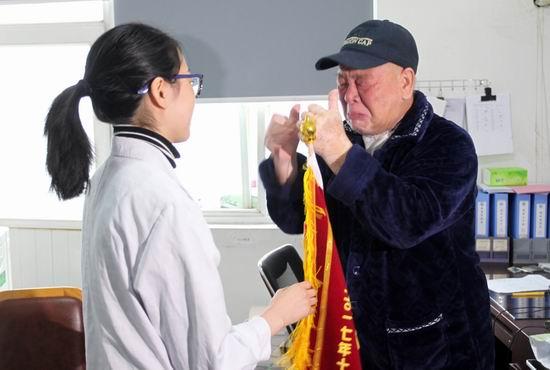 张大爷给兰医生送来锦旗,激动得几次抹眼泪。
