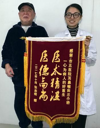 四川新闻网成都10月18日讯(记者 雷兹) 10月17日上午,一位头戴鸭舌帽、身着蓝色睡衣的大爷,双手捧着一面锦旗来到成都市第五人民医院。他一边抹眼泪,一边用手比划,旁边的爱人补充说,“我们要感谢耳鼻喉科兰小娇医生?!?/p>