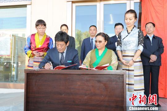 藏医学院院长尼玛次仁(左)与藏医院院长白玛央珍签署共建协议。曾彬摄