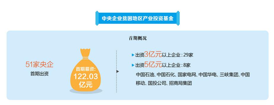 在2016年10·17国家扶贫日,中央企业贫困地区产业投资基金设立。51家中央企业参与基金首期出资,首期募集资金122.03亿元并实缴到位,其中有29家中央企业出资3亿元以上,中国石油、中国石化、国家电网、中国华电、三峡集团、中国移动、国投公司、招商局集团8家中央企业出资5亿元以上。