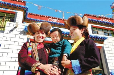 搬迁户高兴地在自家新楼房前合影留念。记者次旺通讯员伦珠泽仁摄