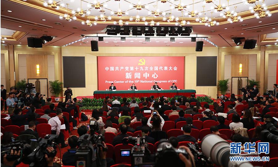 0月21日,十九大新闻中心举办记者招待会,邀请中共中央统战部常务副部长张裔炯、副部长冉万祥,中共中央对外联络部副部长郭业洲介绍党的统一战线工作和党的对外交往情况,并回答记者提问。图为记者招待会现场。新华网 郝广鹏 摄 图片来源:新华网