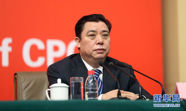 10月21日,十九大新闻中心举办记者招待会,邀请中共中央统战部常务副部长张裔炯、副部长冉万祥,中共中央对外联络部副部长郭业洲介绍党的统一战线工作和党的对外交往情况,并回答记者提问。图为中共中央统战部副部长冉万祥。新华网 郝广鹏摄