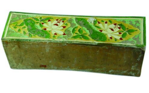 这件宋代三彩听琴图枕,1976年河南济源出土,现收藏于河南博物院。该枕高16、面长63、面宽25、底长60.5、底宽18厘米,呈长方形,形体之大,较为罕见。枕中空,枕面内侧两端各留有一气孔。枕面(图1)中间刻绘菱形开光,其内为听琴图。枕内侧面刻划莲叶托单荷花,外侧面为莲叶托双荷花,两端均刻绘有菱形开光,内各有一枝白牡丹,右侧釉彩已剥落,枕底部不施釉(图2)。