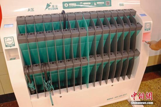 资料图:没带雨伞的民众在共享雨伞的货架上扫码借用。殷立勤 摄