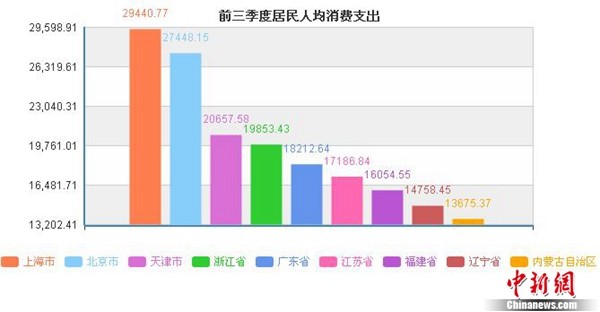 这些地区前三季度居民人均消费支出超过全国平均水平。