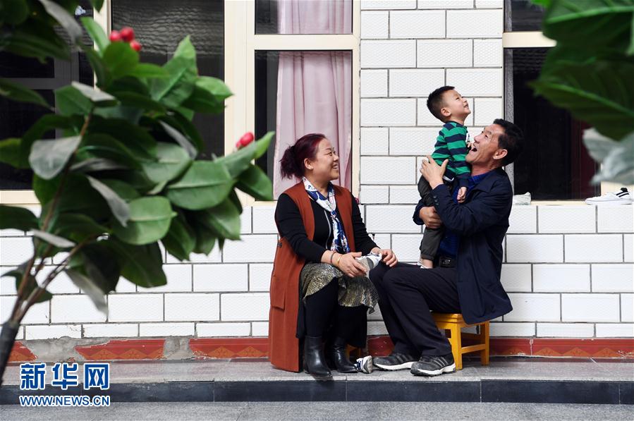 在古浪县黄花滩镇黄花滩村的家中,胡中山(右一)和妻子(左一)陪孙子玩耍(9月27日摄)。新华社记者 范培珅 摄