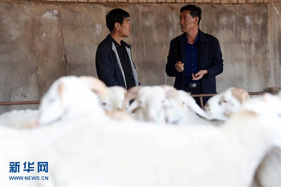 在古浪县黄花滩镇黄花滩村,胡中山(右)走入农户养殖圈舍了解肉羊养殖情况(9月27日摄)。新华社记者 范培珅 摄