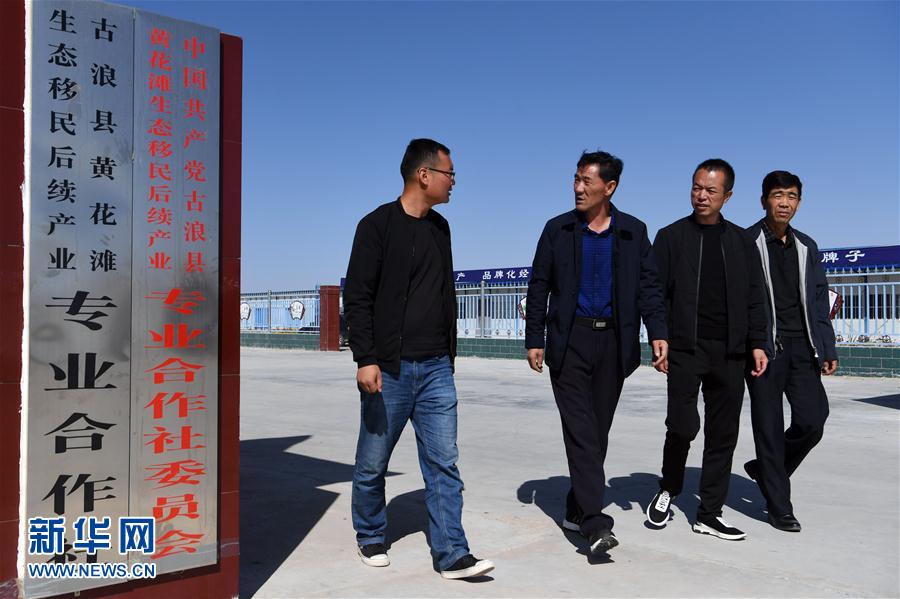 在古浪县黄花滩生态移民后续产业专业合作社,胡中山(左二)和同事边走边商量日光温室建设中遇到的问题(9月27日摄)。新华社记者 范培珅 摄