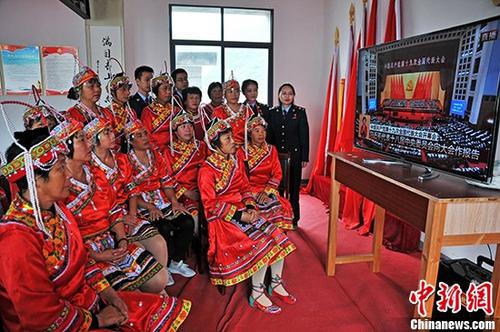 10月18日,在江西省上饶市铅山县篁碧畲族乡畲族村,该村几十位畲族同胞身穿鲜艳的民族服装,齐聚村委会观看十九大开幕式电视直播盛况。 中新社记者 丁铭华 摄