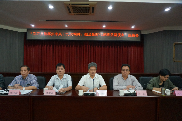 在中共十九大和十九届一中全会刚刚胜利闭幕之际,10月26日下午,民盟福建省委会“学习贯彻落实中共十九大精神,担当新时代参政党新使命”座谈会在民盟泉州市委会机关召开。民盟福建省委会主委阮诗玮,副主委刘泓、洪南福,秘书长刘丹艳,民盟泉州市委会主委陈建通,盟省委各部室负责人及民盟泉州市委会副主委、常委、委员、各地方组织负责人、原专职副主委和全体机关干部参加了座谈。刘泓主持座谈会。