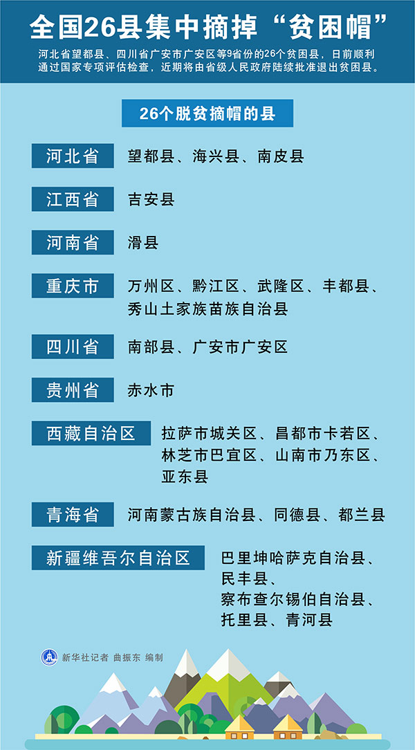 26个脱贫摘帽的县是:河北省望都县、海兴县、南皮县,江西省吉安县,河南省滑县,重庆市万州区、黔江区、武隆区、丰都县、秀山土家族苗族自治县,四川省南部县、广安市广安区,贵州省赤水市,西藏自治区拉萨市城关区、昌都市卡若区、林芝市巴宜区、山南市乃东区、亚东县,青海省河南蒙古族自治县、同德县、都兰县,新疆维吾尔自治区巴里坤哈萨克自治县、民丰县、察布查尔锡伯自治县、托里县、青河县。