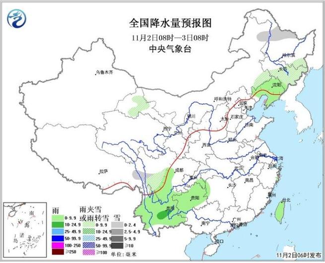 2日08时至3日08时,黑龙江西北部、内蒙古东部、吉林中东部等地的部分地区有小雪或雨夹雪;四川南部、云南、贵州等地的部分地区有阵雨或小雨,局地有中雨。南海中部和南部海域将有7~8级、阵风9~10级的旋转风,渤海、黄海、东海等海域将有6~7级、阵风8~9级的偏北风。