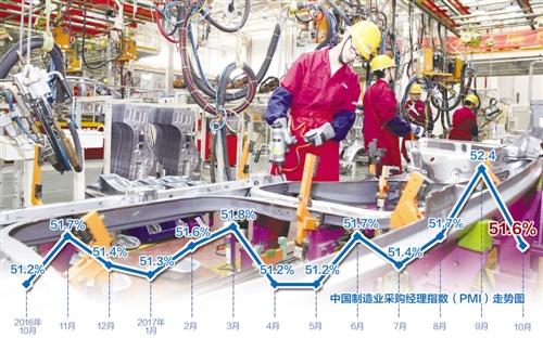 10月份,制造业PMI为51.6%,虽比上月回落0.8个百分点,但仍比去年同期高0.4个百分点,达到今年均值水平,且连续13个月保持在51%以上较高水平,表明制造业持续保持扩张的发展态势。