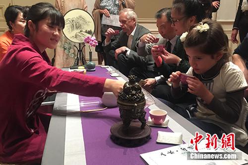 当地时间11月2日,比利时布鲁塞尔中国文化中心举办中国传统文化生活艺术演展,中国传统文化生活“君子四雅”(品茗、闻香、观画、插花)逐一亮相,展示中国艺术与生活之美。在茶道展示现场,茶艺师“以茶会友”,与现场观众把盏品茗。中新社记者 德永健 摄