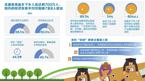 “这是一支庞大的力量,是巨大的人口红利?!比┐宕匆荡葱峦平骰瓢旃抑魅巍⑴┮挡颗┎芳庸ぞ志殖ぷ诮跻?据最新统计,各类返乡下乡人员已达700万人,创办的经济实体平均可吸纳7至8人就业;其中返乡农民工比例为68.5%,涉农创业占比为60.0%;农村“双创”人员平均年龄44.3岁,学历为高中、职高或者大专的比例为40.7%。