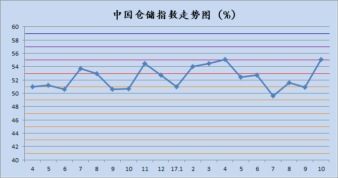 中国物流与采购联合会与中储发展股份有限公司联合调查的2017年10月中国仓储指数为55.1%,较上月回升4.2个百分点。各分项指数中,除企业员工指数较上月有所回落外,其余指数均有不同程度的回升。