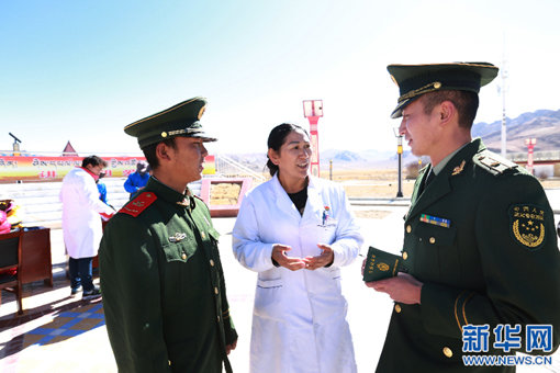 十九大代表阿里地区人民医院次仁巴珍(中)与阿里边防支队官兵在辖区日松乡甲岗村讲解高原常见疾病的知识。王国华摄