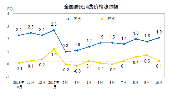 统计局:10月CPI同比上涨1.9% 环比上涨0.1%