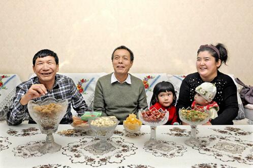 10月29日,阿不都瓦依提·买买提(左一)与杨卫祖(左二)在乌鲁木齐市的朋友家做客。秦梅花摄